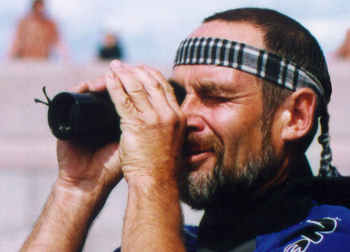 Старейший гонщик - Виктор Рыбальский близоруко щурится на знаки дистанции